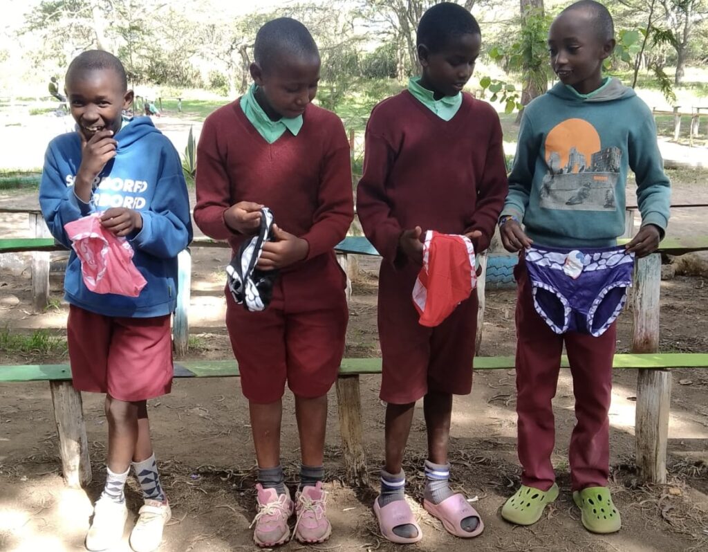 So, this week, the girls showed up at the boys’ meeting armed with underwear and pads to help explain about menstrual hygiene. They also talked to the boys about how menstruation makes them feel shy or embarrassed because of teasing, and how it can make them miss school. After the demonstration by the girls, four volunteer boys were invited to repeat the process. “The boys carefully demonstrated how pads are placed on underwear, which helped reinforce their understanding of menstrual hygiene. This activity was intended to help boys appreciate the challenges girls face during menstruation and to promote respect and support rather than teasing.”