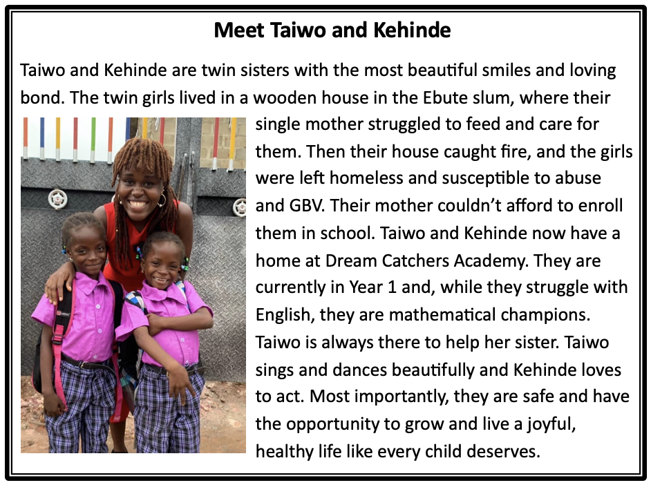 Dream Catchers Academy focuses primarily on impoverished girls living in slum environments, where they must deal not only with poverty and trauma but are targets of gender-based violence and forced child marriage. Every year, Seyi and her team go into the most hopeless and marginalized communities to select young girls and give them a chance at a sustainable and exciting future. The girls are given a safe place to live, three meals a day, psychological counseling, an academic education, and training in the performing arts. The goal of Dream Catchers Academy is to help the girls find healing, develop resilience, and gain skills to allow them to become financially independent adults.